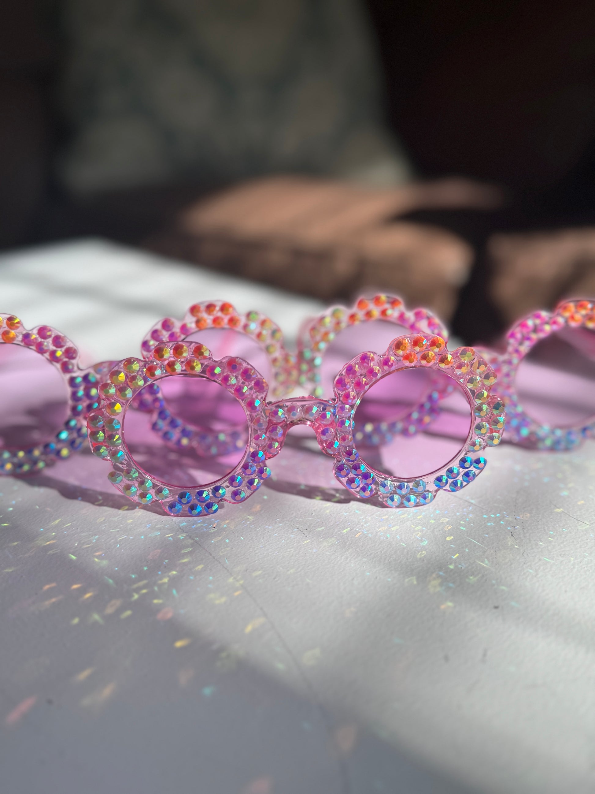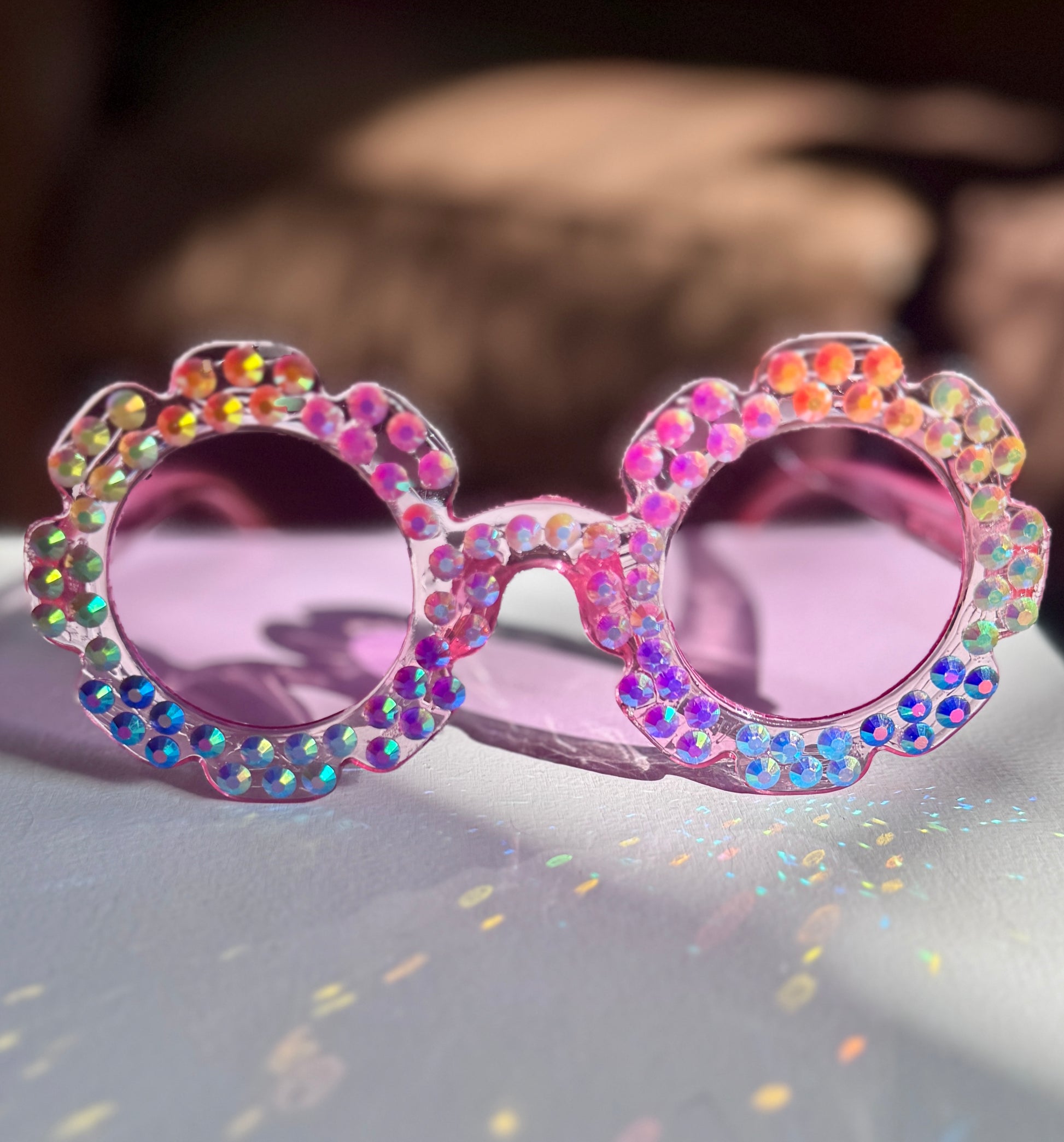✨Shine bright in these hand-beaded, flower-shaped sunglasses! Each pair is carefully decorated to catch the light and spark joy 🌈💎
